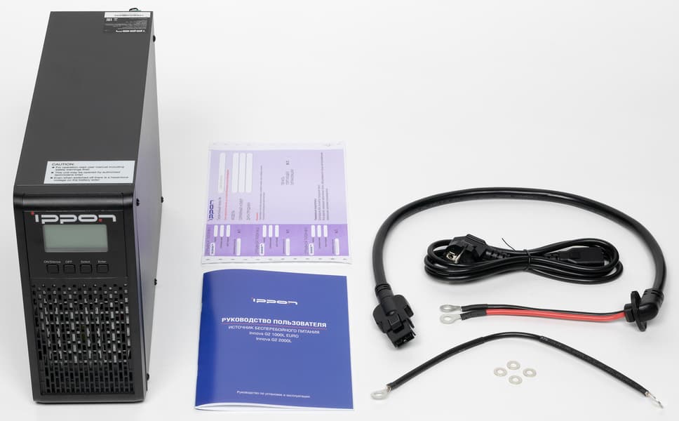 Комплектация у модели Innova G2 Euro 1000L следующая: кабель для подключения к внешней сети переменного тока, инструкция на русском языке и гарантийный талон. У модели 2000L добавляются два кабеля C13/C14 для подключения нагрузок. Интерфейсный кабель USB при необходимости следует приобретать самостоятельно.