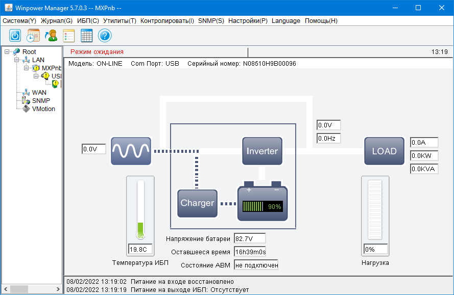 После подключения видим информацию о состоянии источника, включая журнал событий.