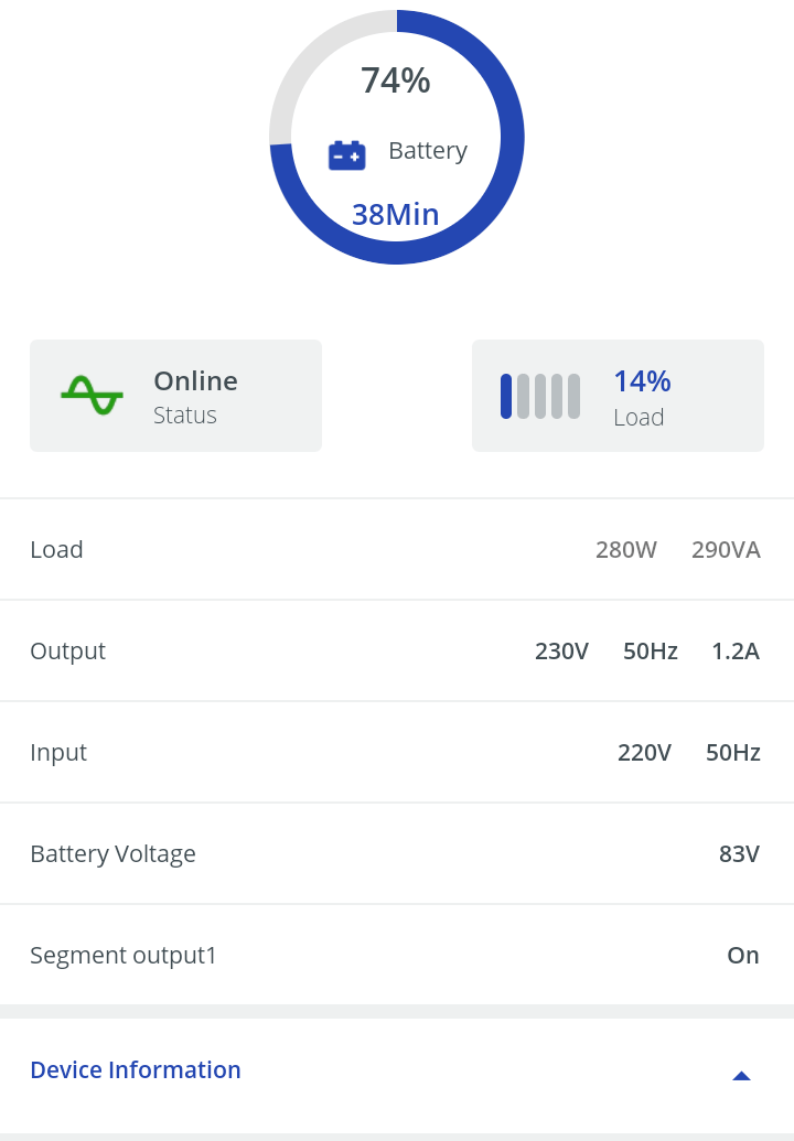 При наличии нескольких ИБП, подключенных к облачному сервису, приложение позволит просматривать их списком с кратким описанием состояния (у нас по понятным причинам получилась только одна строчка):
