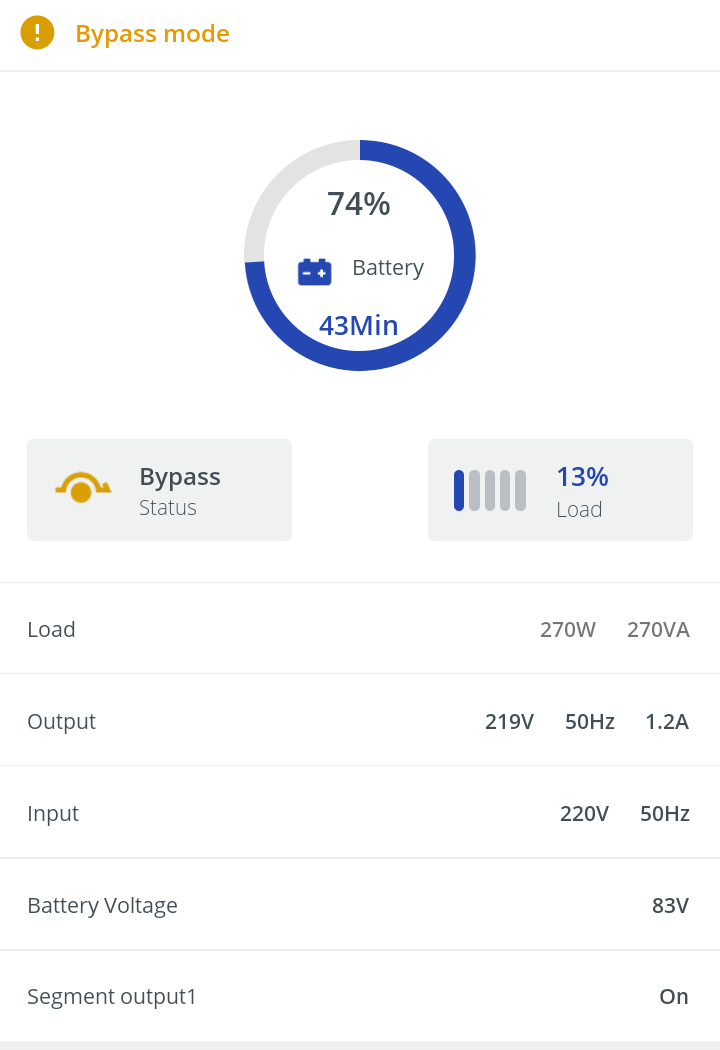 Четыре последних строчки — работа от батареи с превышением номинальной мощности. Пока это превышение по оценке самого ИБП было не более пяти процентов, автономная работа явно велась до исчерпания заряда, а при дальнейшем увеличении нагрузки срабатывал двухминутный лимит, упомянутый в приведенной на официальном сайте спецификации, но только происходило отключение, а не бессмысленный в данной ситуации переход на байпас, как там написано.