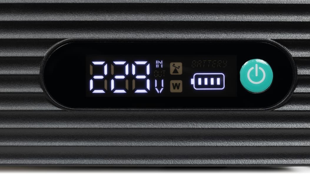 Длительное (около 2 секунд) нажатие кнопки включает/выключает источник (точнее, задействует его выходы: заряд батареи идет в любом случае, требуется лишь подключение к сети переменного тока). Короткое нажатие при включенном ИБП переключает отображаемый на индикаторе параметр: суммарная выходная мощность (сопровождается дополнительными значками «Out» и «W») или напряжение на входе (значки «In» и «V»).