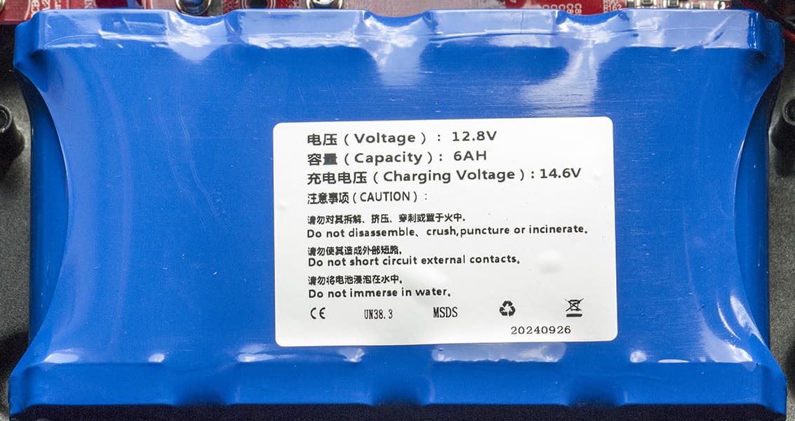 Используется аккумуляторная батарея с заявленными напряжением 12,8 В и емкостью 6 А·ч (76,8 Вт·ч), состоящая из четырех последовательно соединенных элементов LiFePO4. Она закреплена П-образной накладкой на четырех винтах и подключается с помощью разъемов.
