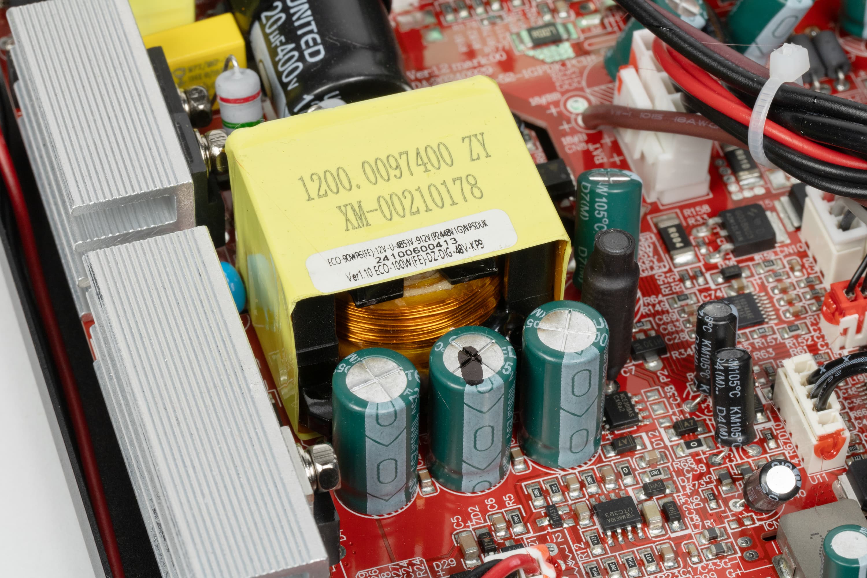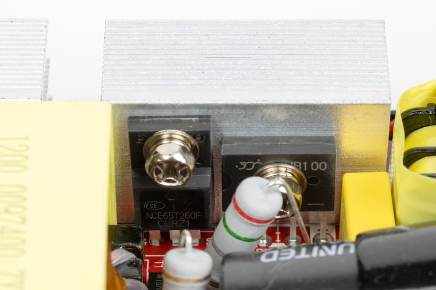 Выпрямитель и мощный полевой транзистор NCE65T260F входного преобразователя AC/DC установлены на алюминиевом ребристом радиаторе, на втором подобном радиаторе установлена сборка из двух мощных диодов Шоттки TSR 20V120CT.