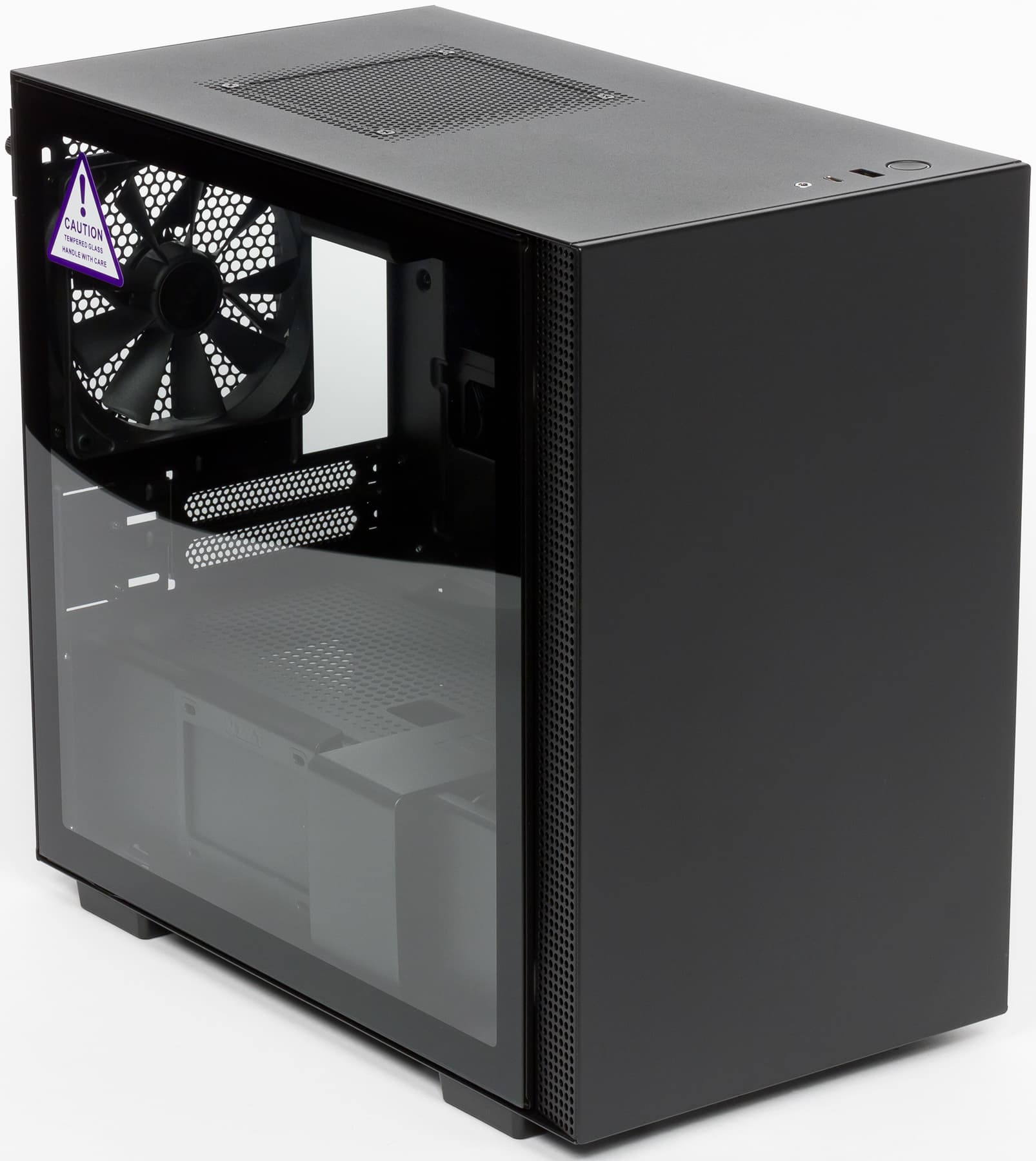 Два вентилятора (типоразмера 120 мм) предустановлены: один сзади и один сверху. Это вентиляторы собственного производства NZXT из серии Aer F. Они оснащены подшипниками скольжения с винтовой нарезкой, встроенной подсветки у них нет. Разъем у вентиляторов стандартный трехконтактный с управлением изменением питающего напряжения.