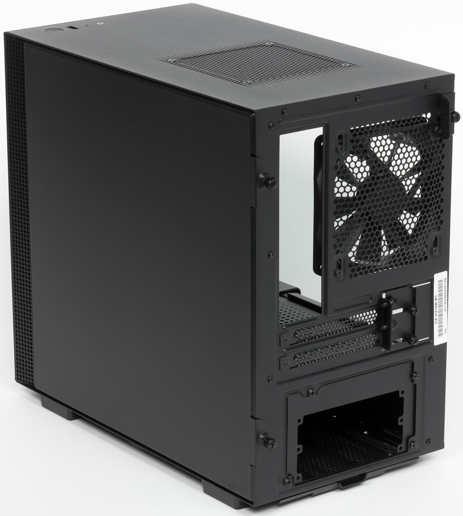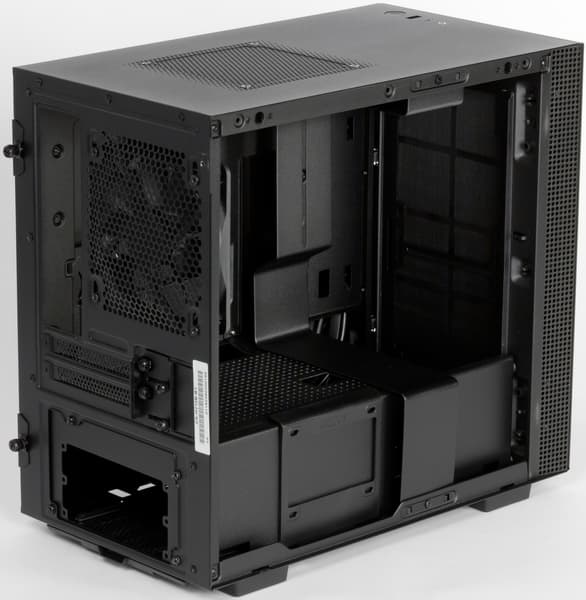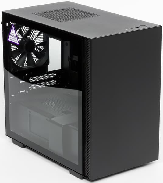 Скажем несколько слов о модификациях данной модели. Их всего две: H210i, оснащенная программно-аппаратным комплексом управления вентиляторами и подсветкой (мы изучали такое решение на примере NZXT H200i), и H210, которая лишена данного комплекса. Обе модификации поставляются в трех расцветках: черной, белой и черно-красной. Белая расцветка называется matte white, но ее можно считать черно-белой, поскольку она предполагает наличие и белых, и черных деталей, что выглядит весьма выигрышно за счет их контраста. Нам же на тест был предоставлен корпус в наиболее утилитарной расцветке — полностью черный.