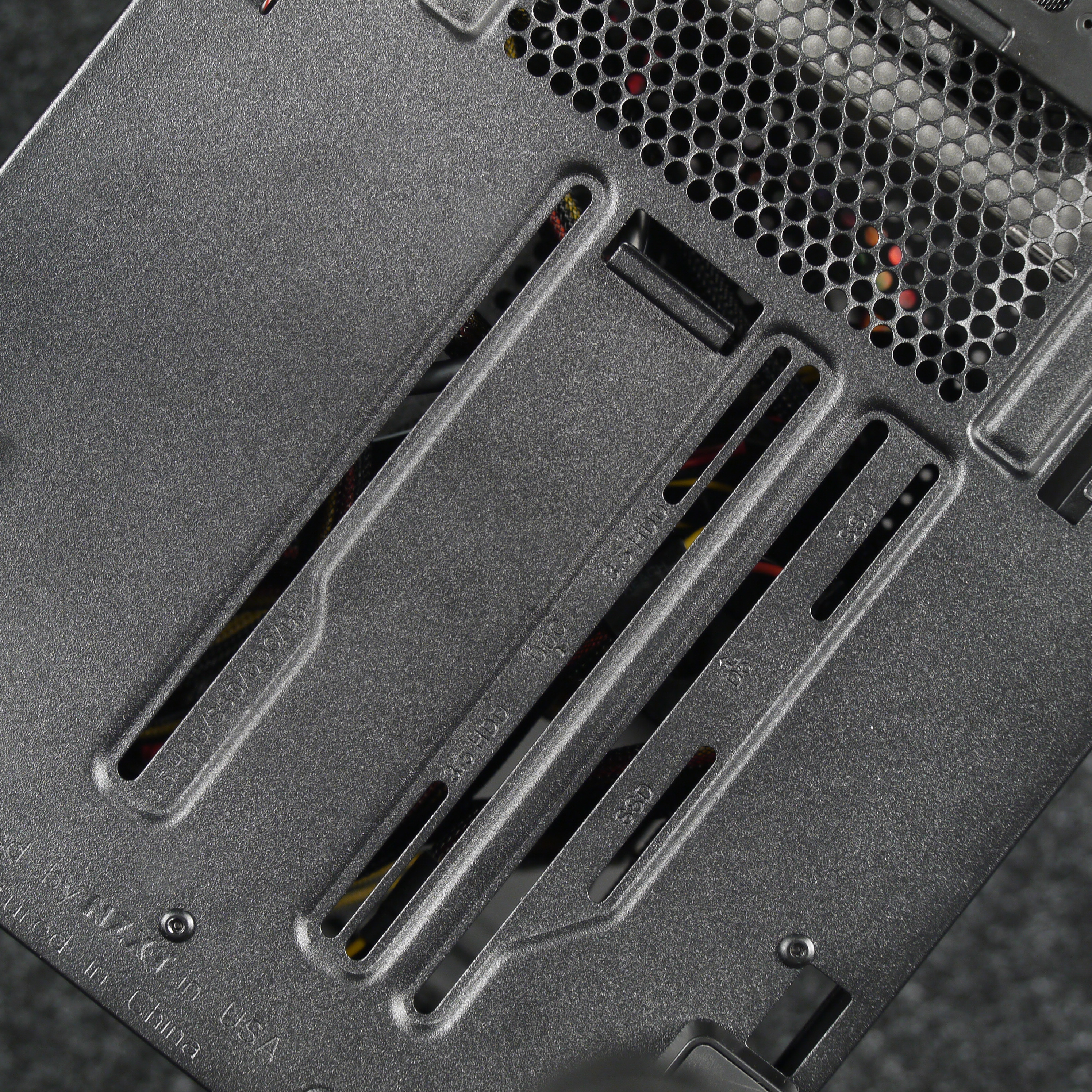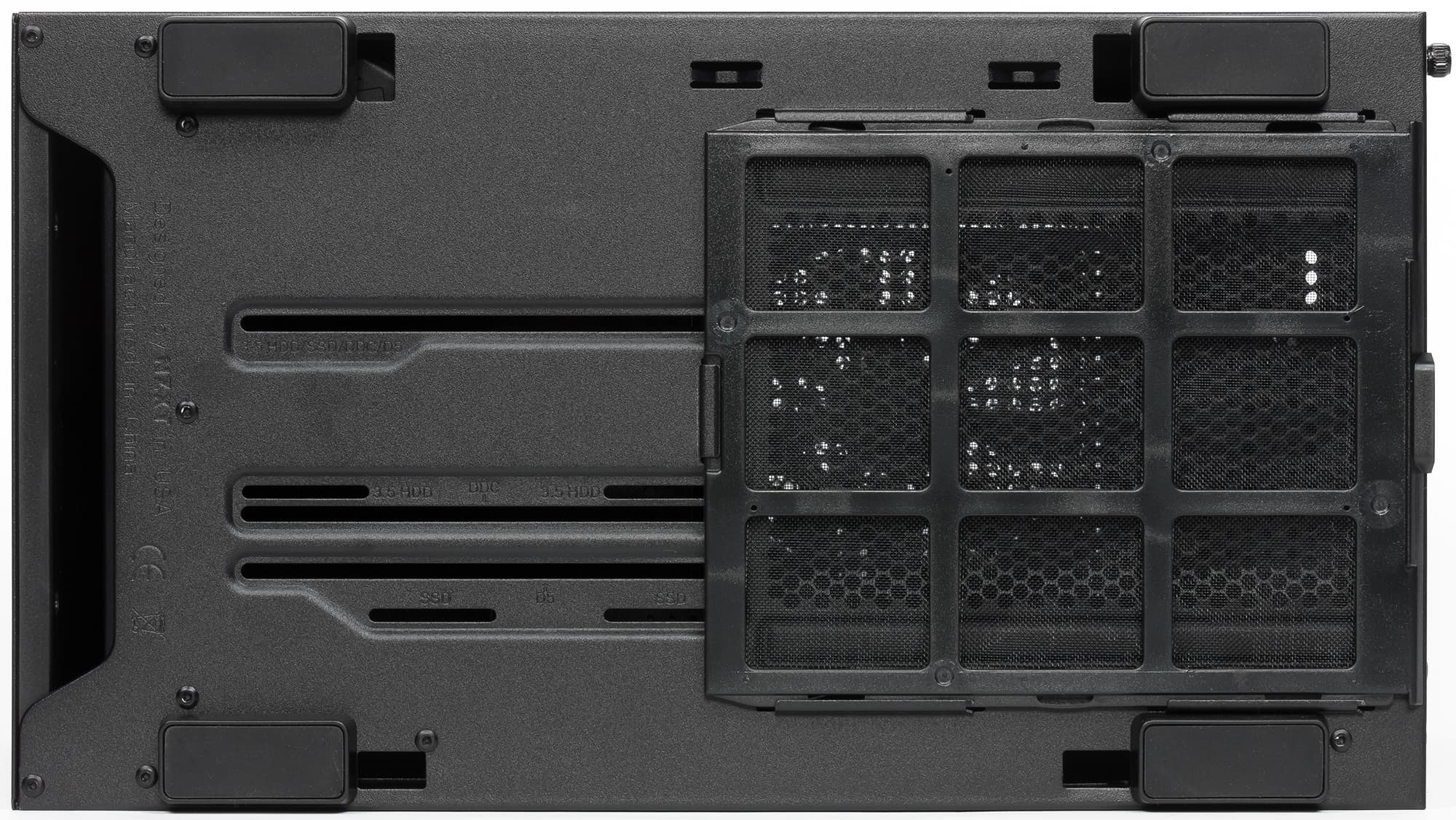 Компоновочные решения данной модели определяются современными тенденциями корпусостроения. В данном случае разработчики отказались от отсека для устройств формата 5,25″, отсутствует и привычный отсек для устройств 3,5″ около передней стенки шасси — вместо него есть универсальная монтажная площадка для установки, в том числе, помпы СЖО. При желании туда можно установить и накопитель, для чего есть разметка на дне корпуса.