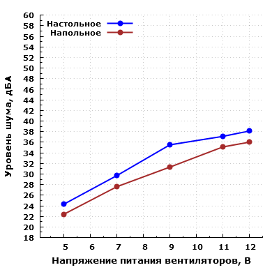 При большем удалении корпуса от пользователя и размещении его, к примеру, на полу под столом, шум можно будет охарактеризовать как минимально заметный при питании вентиляторов от 5 В, а при питании от 12 В — как средний для жилого помещения в дневное время суток.