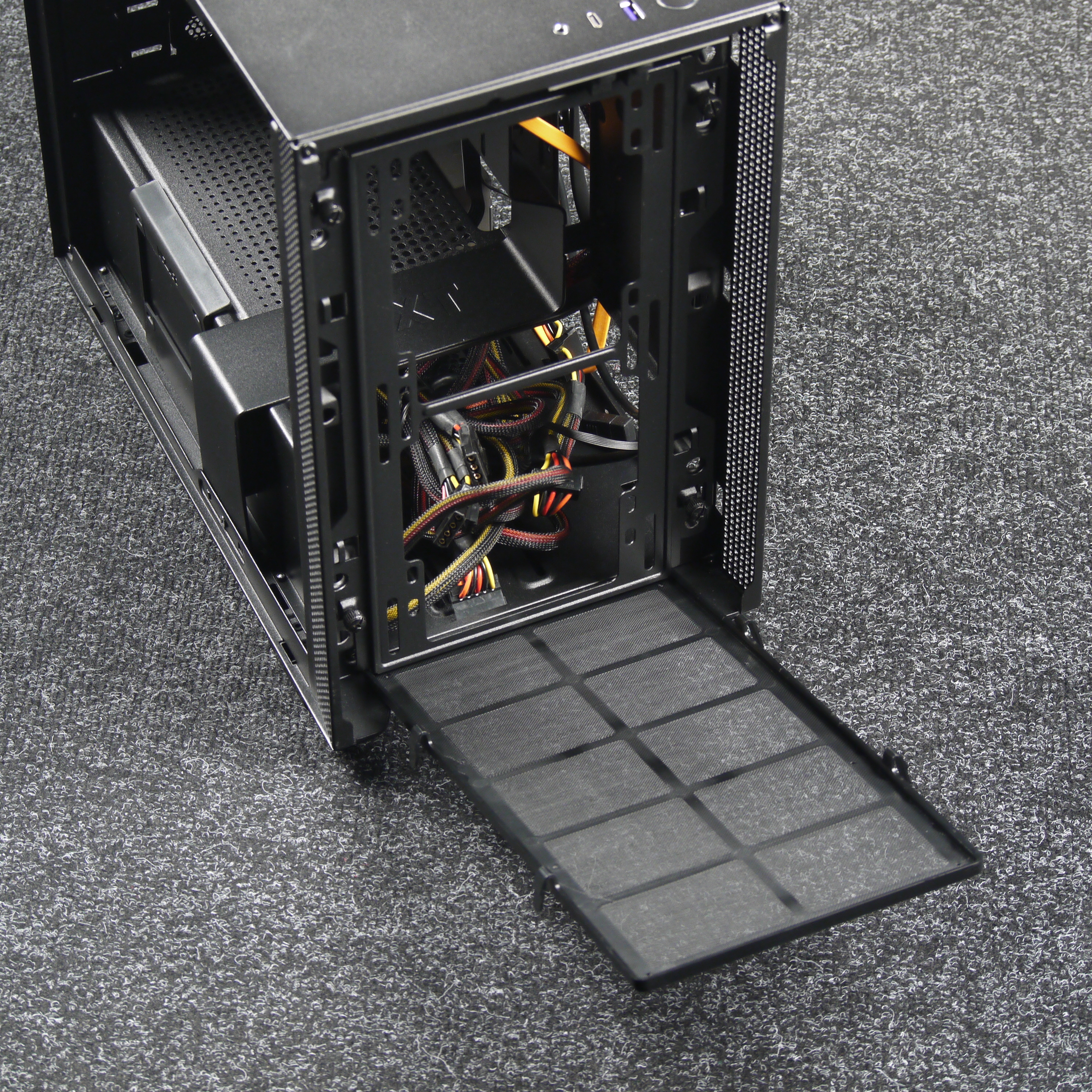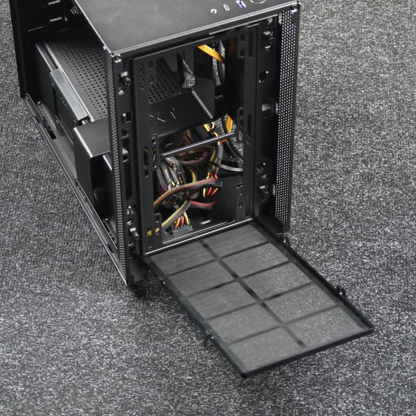 Единственный действительно быстросъемный фильтр установлен под блоком питания, его можно извлечь и поставить на место без необходимости класть корпус на бок.