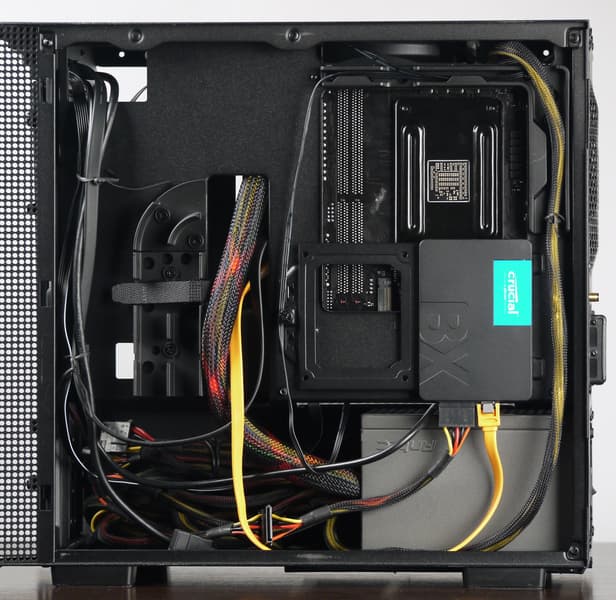 Проектировщики NZXT предусмотрели достаточно удобную систему укладки проводов, которая с правой стороны состоит из пластиковых каналов, направляющих, липучек и тканевых стяжек, а с левой — из прорезей в нужных местах и скрывающей выходящие кабели стальной полосы. Если грамотно подобрать сочетание блока питания (как вариант — дополнительных удлинителей для него) и системной платы, то финальная сборка будет выглядеть максимально лаконично.