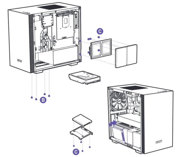 Передние компоненты системы охлаждения устанавливаются на съемный кронштейн, который фиксируется четырьмя винтами с накатной головкой, расположенными со стороны передней панели корпуса. Кронштейн также снимается снаружи — после демонтажа передней панели и пылевого фильтра.