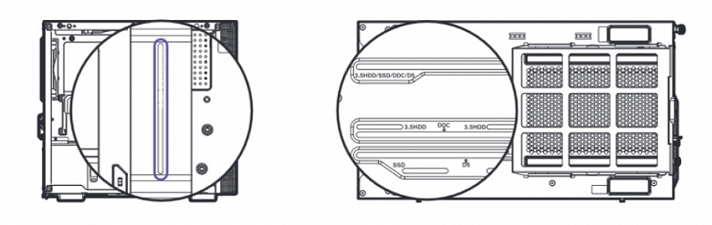 На посадочное место, расположенное на днище корпуса около передней панели, можно установить отдельный накопитель формата 2,5 или 3,5 дюйма, а также компоненты СВО.