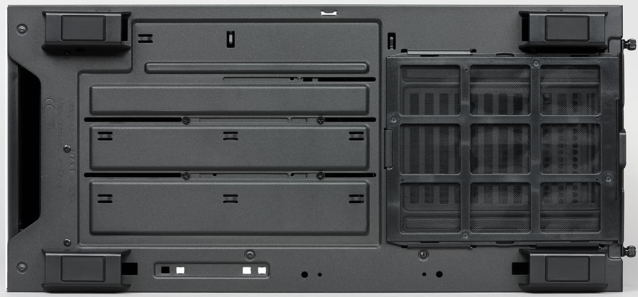 Корпус устанавливается на прямоугольные ножки с накладками из резины средней жесткости, которые обеспечивают ему хорошую устойчивость и позволяют гасить небольшие вибрации, исходящие от вентиляторов и жестких дисков, даже при условии установки на твердой поверхности.