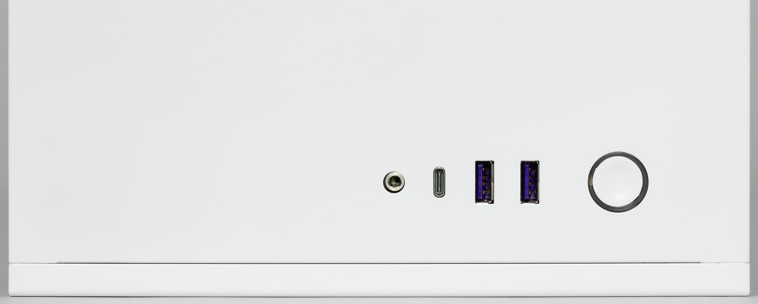 Кнопка включения и порты ввода/вывода, в состав которых входят 2 USB 3.2 Gen 1 (USB 3.0) Type-A, USB 3.2 Gen 2 (USB 3.1) Type-C и разъем для подключения гарнитуры, находятся на верхней стенке в передней части корпуса. Таким образом, корпус позволяет подключать проводные гарнитуры как с цифровым, так и с аналоговым интерфейсом со стороны передней панели. Но разъемов USB все-таки маловато.