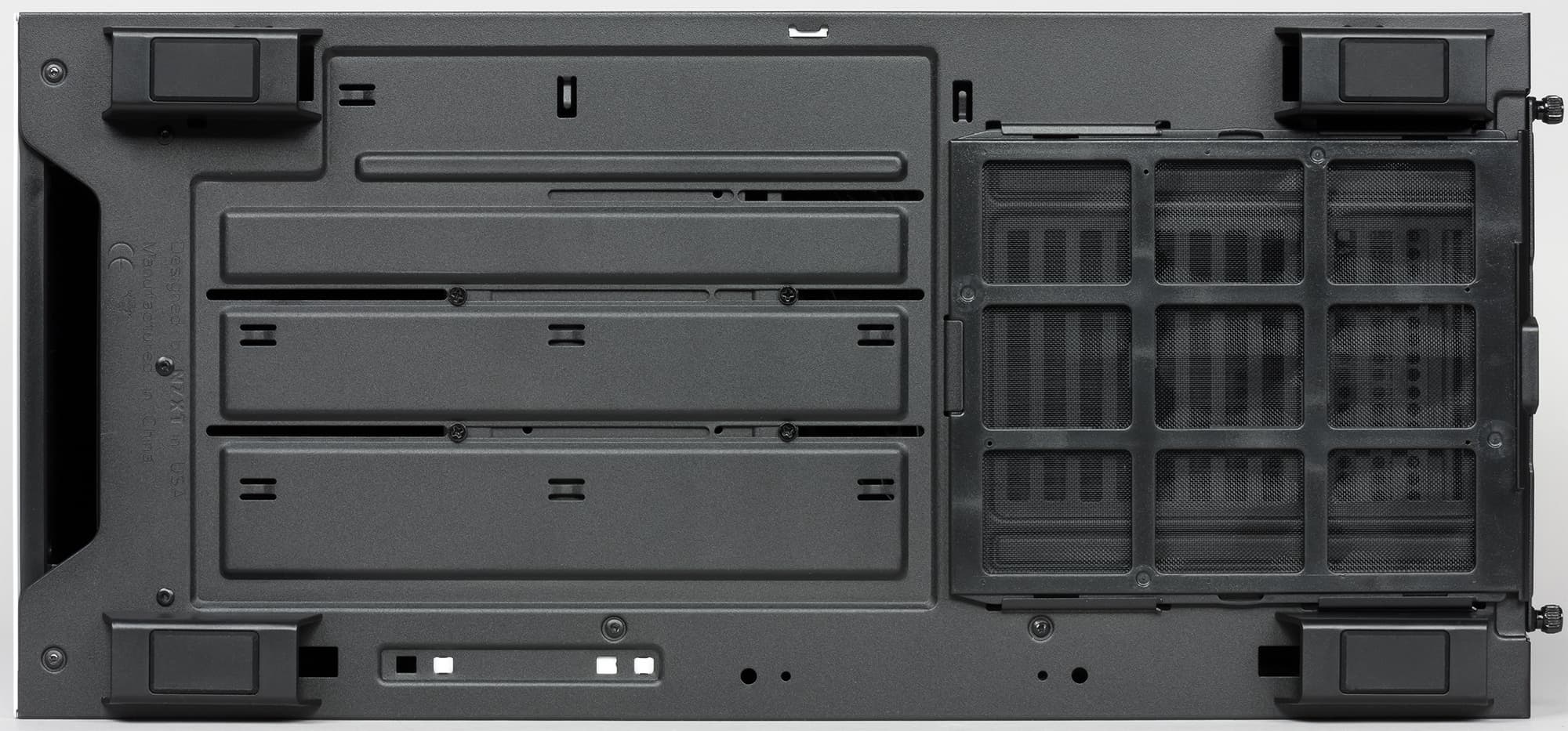 Вторая боковая стенка крепится довольно оригинальным способом: с помощью безвинтовой системы, которая расположена в верхней части шасси. Для снятия стенки нужно нажать кнопку на задней панели и вытащить стенку. Для установки обратно достаточно вставить ее на место и захлопнуть. Стенка имеет П-образную, скорее даже полукруглую вальцовку со всех четырех сторон.
