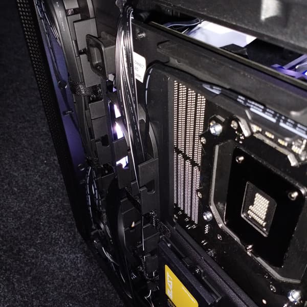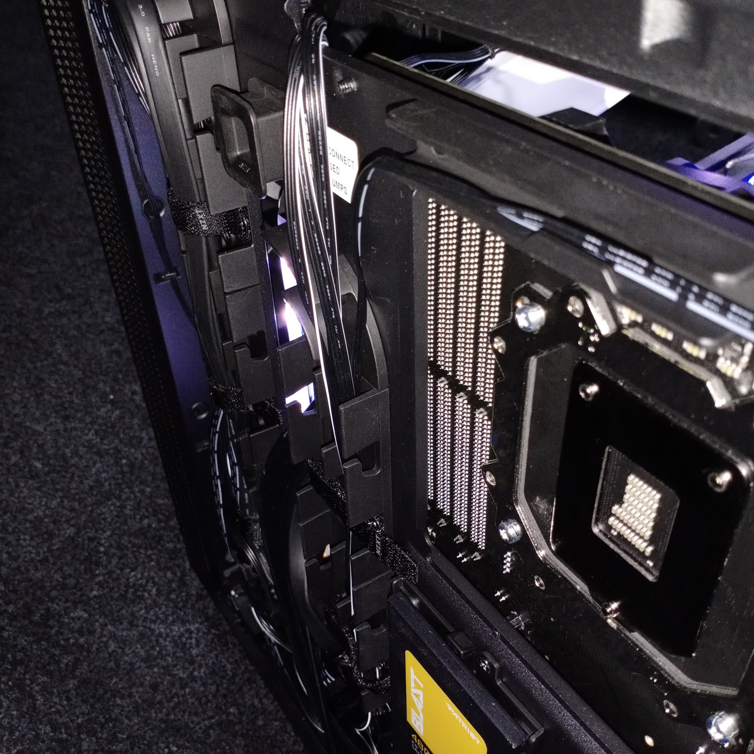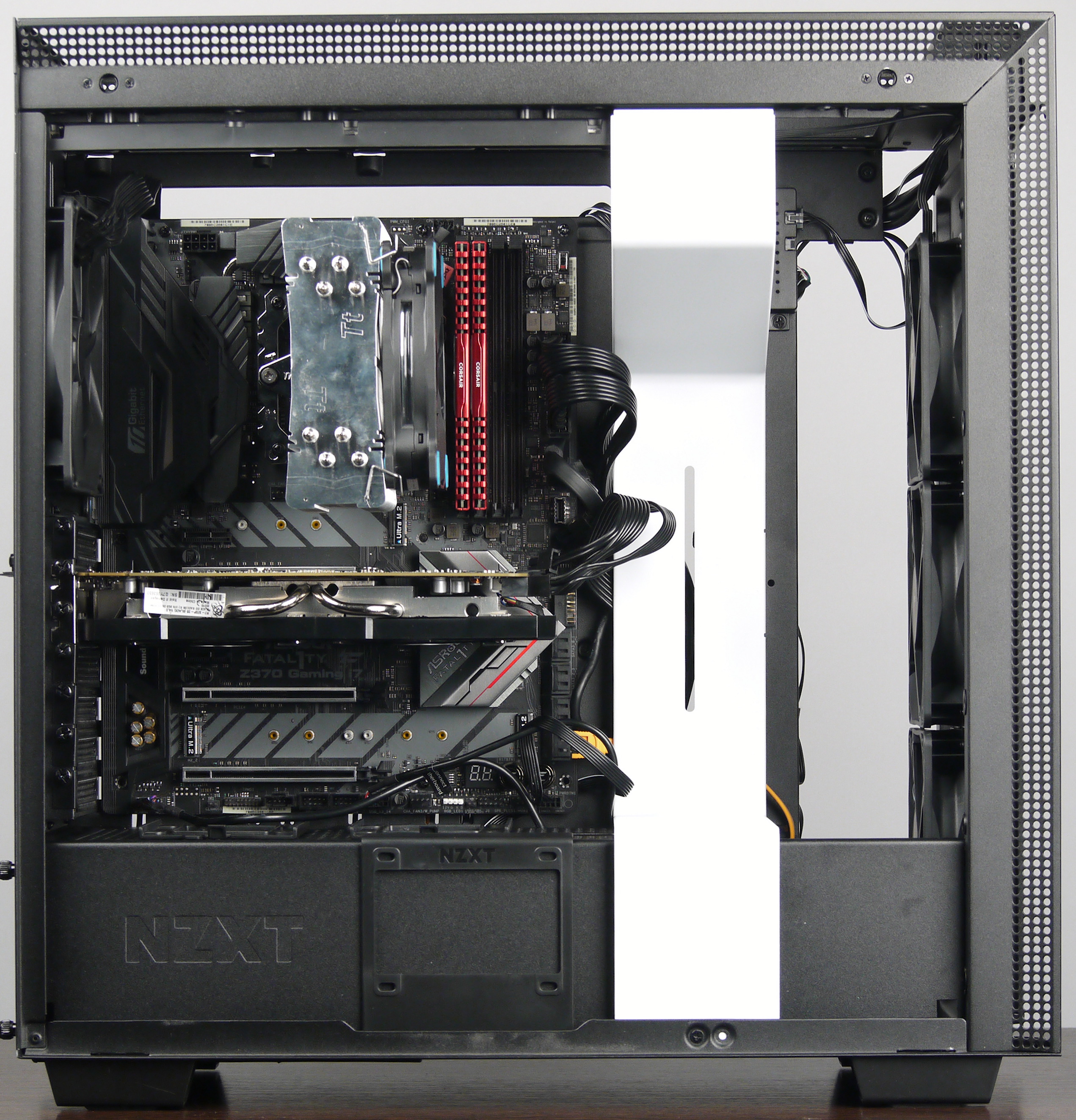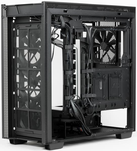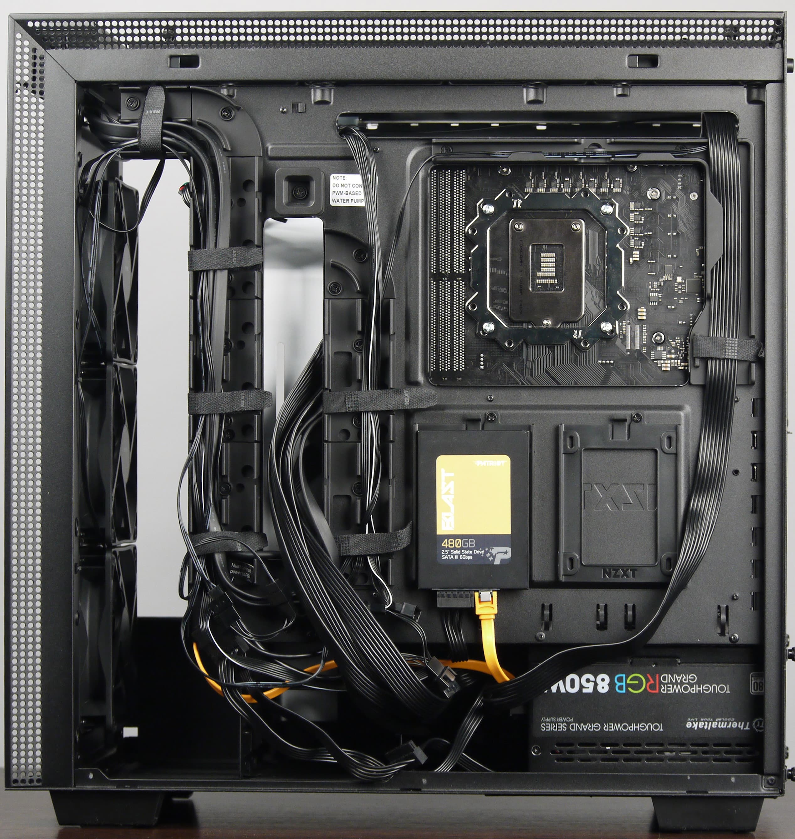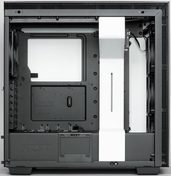 Проектировщики NZXT предусмотрели достаточно удобную систему укладки проводов, которая с правой стороны состоит из пластиковых каналов, направляющих, липучек и тканевых стяжек, а с левой — из прорезей в нужных местах и скрывающей выходящие кабели белой стальной полосы. Если грамотно подобрать сочетание блока питания (как вариант — дополнительных удлинителей для него) и системной платы, то финальная сборка будет выглядеть максимально лаконично.