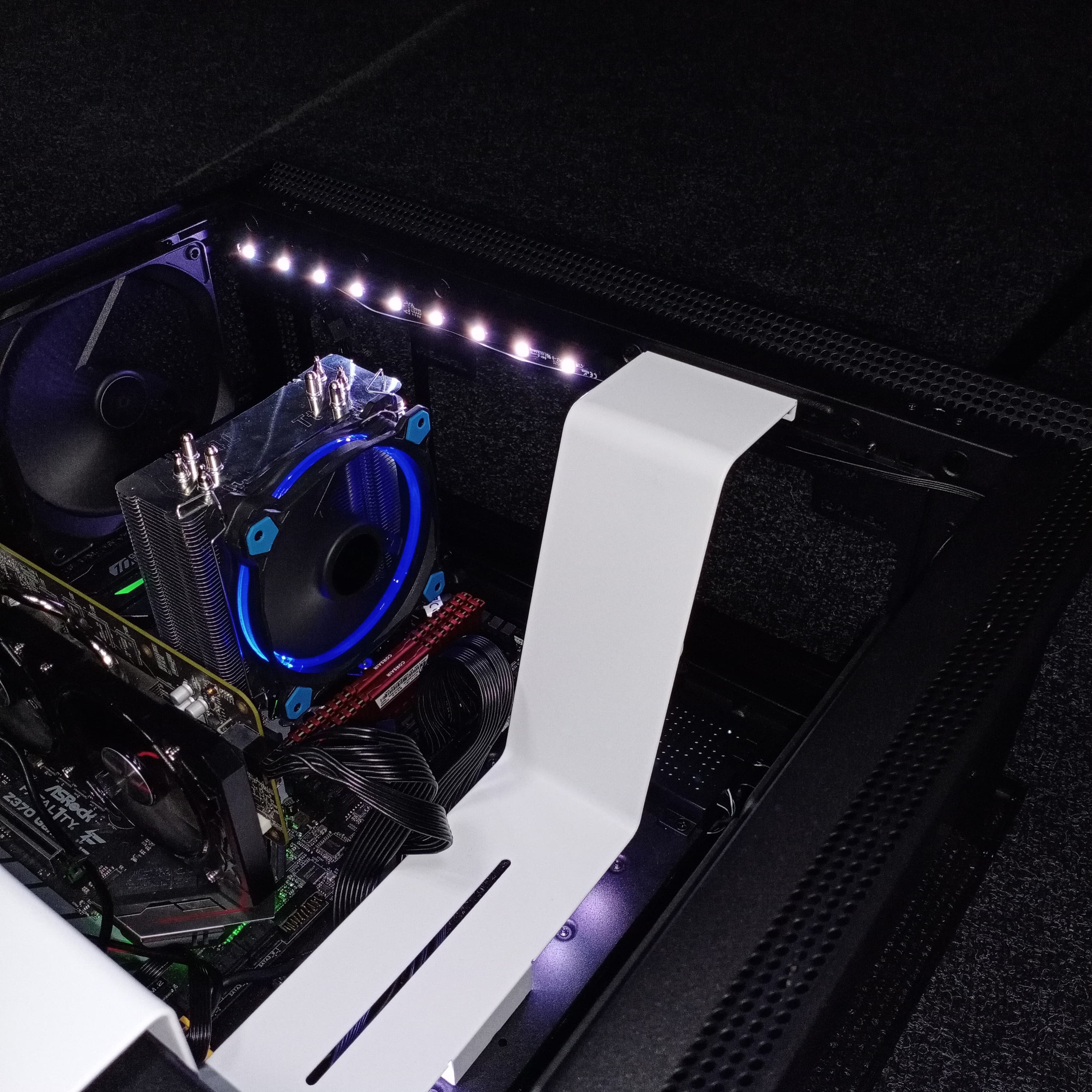 Одна лента расположена на верхней панели вдоль стеклянной стенки так, что ее не видно снаружи, и светит она вниз. Вторая лента размещена на стальной пластине внутри корпуса между системной платой и передней стенкой шасси.