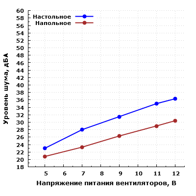 При большем удалении корпуса от пользователя и размещении его, к примеру, на полу под столом, шум можно будет охарактеризовать как минимально заметный при питании вентиляторов от 5 В, а при питании от 12 В — как пониженный для жилого помещения в дневное время суток.