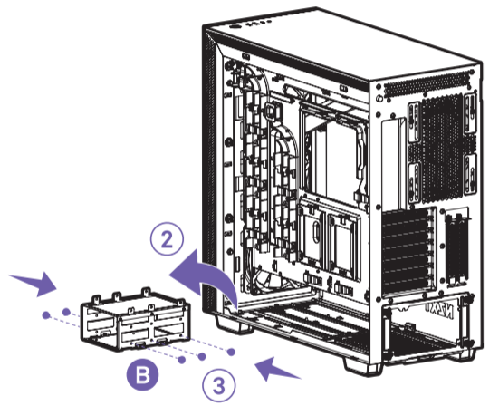 Фиксируется корзина при помощи четырех винтов, которые закручиваются через дно корпуса снаружи, и ее можно при необходимости снять. На это же посадочное место можно установить отдельный накопитель формата 2,5 или 3,5 дюйма, а также компоненты СВО. Корзина имеет три посадочных места для накопителей формата 3,5 дюйма, нижний накопитель можно заменить на диск формата 2,5 дюйма, однако корзину для этого придется снять. Крепление всех накопителей в корзине осуществляется при помощи винтов. Никаких амортизирующих элементов не предусмотрено.