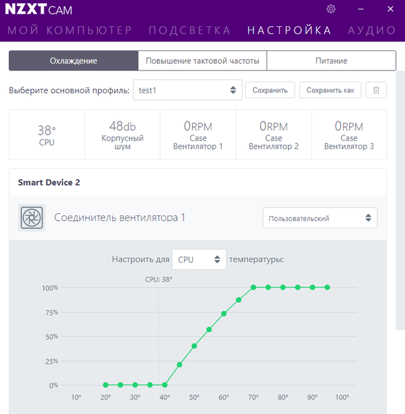 Многофункциональный контроллер для управления вентиляторами и подсветкой настраивается только и исключительно при помощи фирменного ПО NZXT Cam. Более универсальным видится управление вентиляторами при помощи хаба, который подключается к системной плате, как, например, в NZXT H440. Управление же подсветкой вполне можно возложить на системную плату (и ее фирменное ПО). Но и применяемый вариант, разумеется, имеет право на жизнь. Все-таки единый программный интерфейс создает определенное удобство.