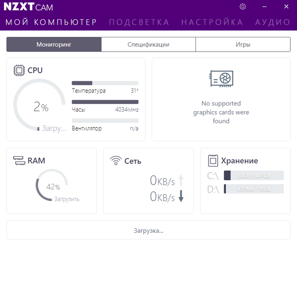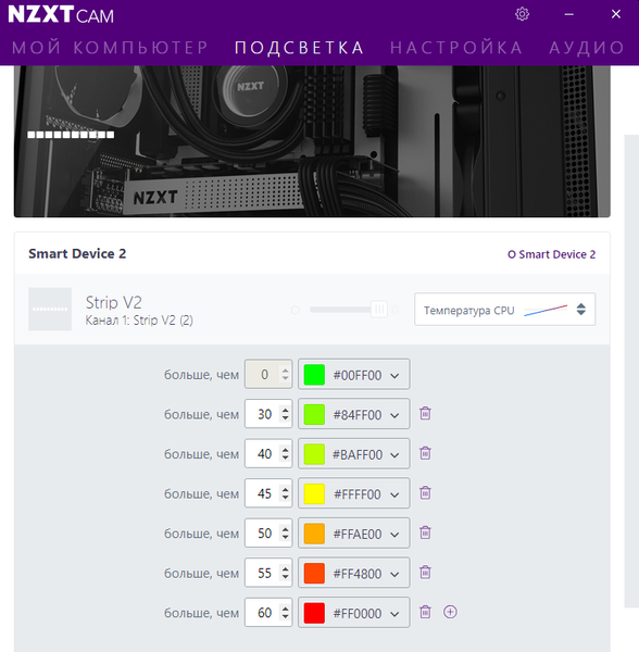 Управление подсветкой поддерживается только программное — про помощи ПО NZXT Cam, которое нужно скачать с сайта camwebapp.com. Внешних органов управления, а также управления подсветкой через ПО системной платы не предусмотрено.