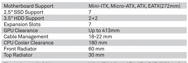 Корпус представляет собой решение башенного типа с вертикально размещаемой платой формата E-ATX (шириной до 280 мм) или ATX (и менее габаритной) и горизонтальным расположением блока питания снизу на дне корпуса.
