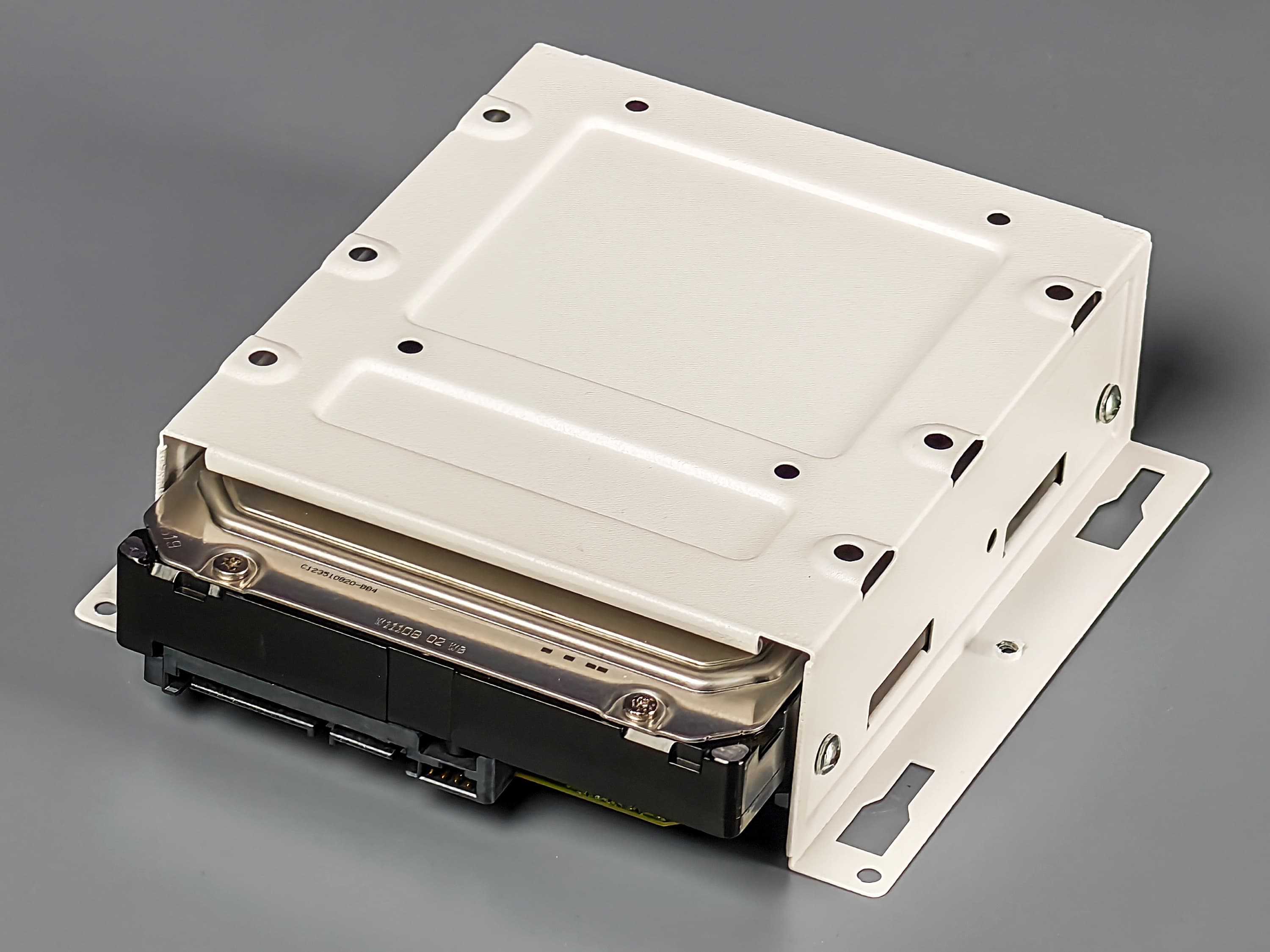 В официальном описании говорится о двух дисках размером 3,5 дюйма, но в реальности дело обстоит немного иначе: один такой накопитель может быть установлен внутри корзины, а снаружи сверху можно разместить второй любой из двух размерностей — в верхней крышке корзины имеются соответствующие отверстия, через которые накопители крепятся имеющимися в комплекте винтами.