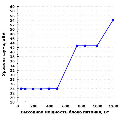 При работе с постоянно вращающимся вентилятором в диапазоне мощности до 500 Вт включительно шум блока питания находится на очень низком уровне для жилого помещения в дневное время суток.