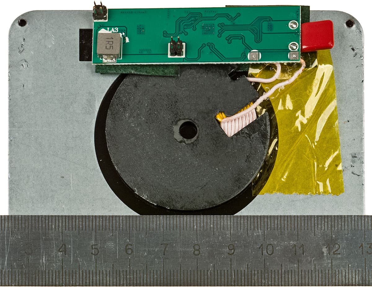 Стальная пластина верхней крышки, являющейся поверхностью взаимодействия базовой станции (Base Station, термин из спецификации WPC), имеет круглый вырез, в который вклеена однослойная катушка.