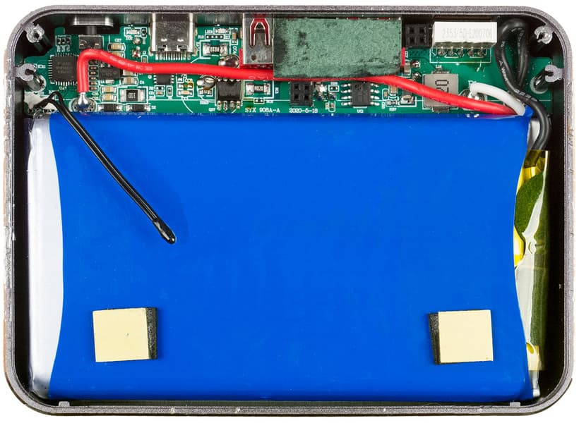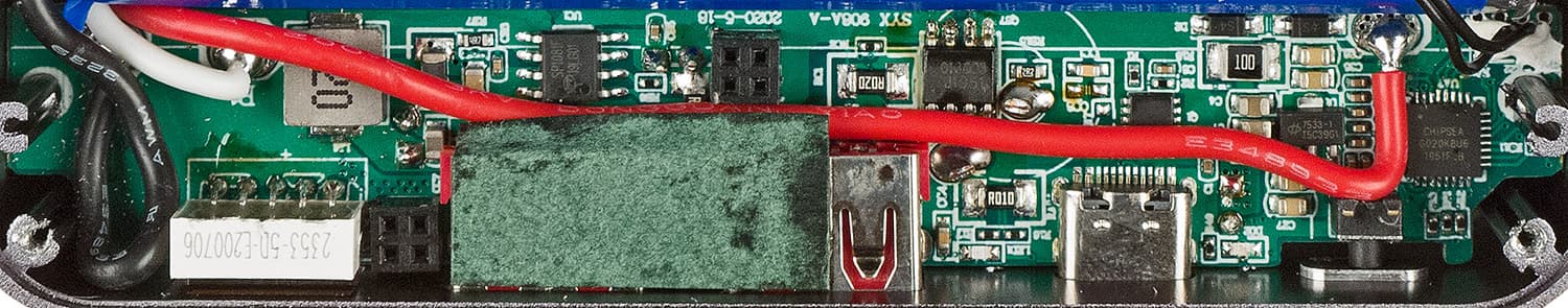 Работой «проводной» части управляет контроллер Chipsea G020K8U6, который часто встречается в различных пауэрбанках. Черная «капелька» на сдвоенной ножке, которая видна на одном из фото, это термодатчик, при установленной на место крышке он прижимается к батарее, то есть контроль температуры предусмотрен.