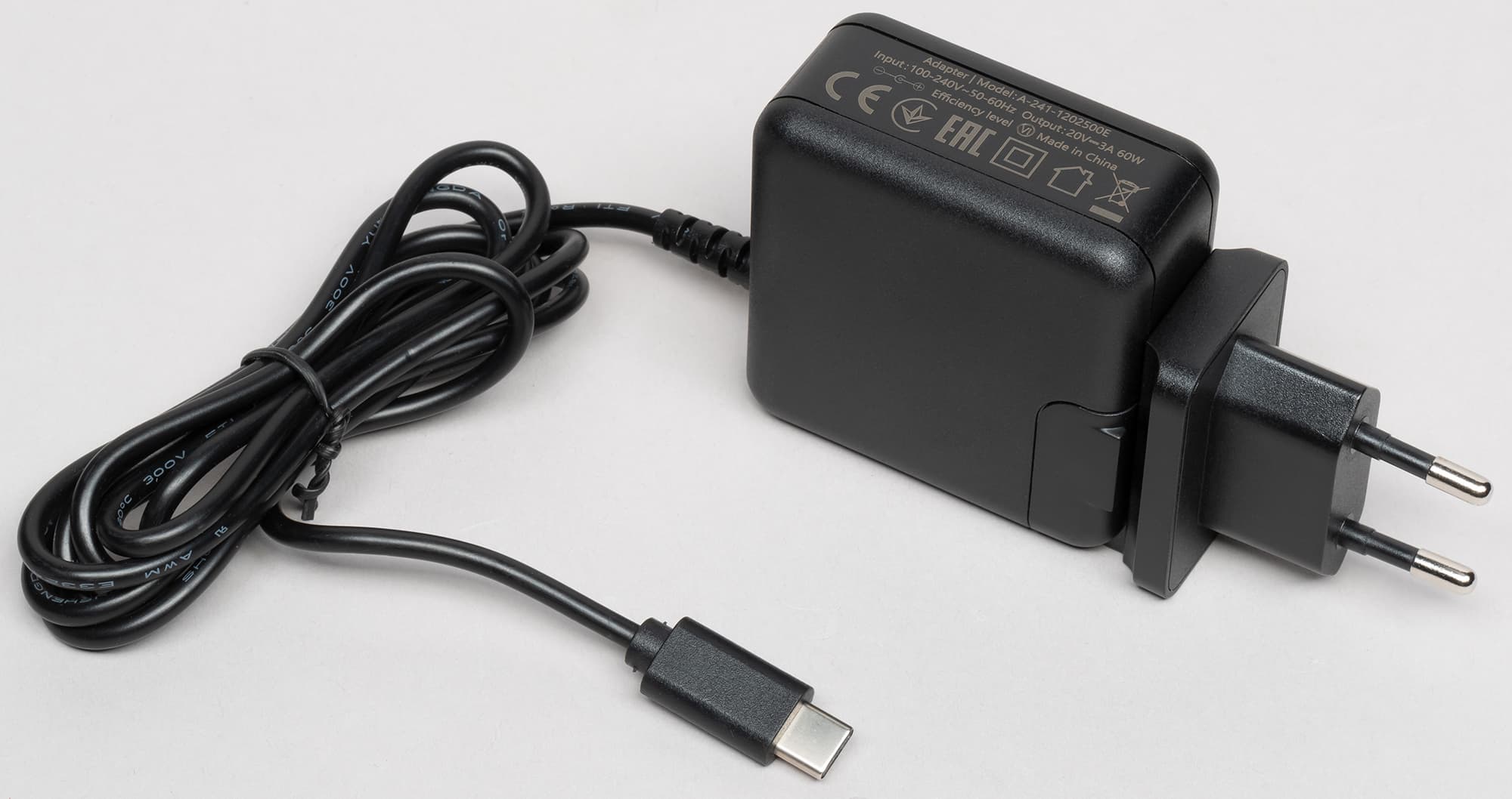 Никаких упоминаний Power Delivery нет, и действительно: подключение к соответствующему тестеру показало, что это не полноценный PD-адаптер, обеспечивающий разные режимы в обозначенных пределах, а просто 20-вольтовый блок питания с предельным током до 3 ампер и разъемом Type-C, причем он даже не распознается как поддерживающий PD. Другой тестер, попроще — не «умеющий» работать с PD, попросту показал наличие 20 вольт на выходе адаптера.
