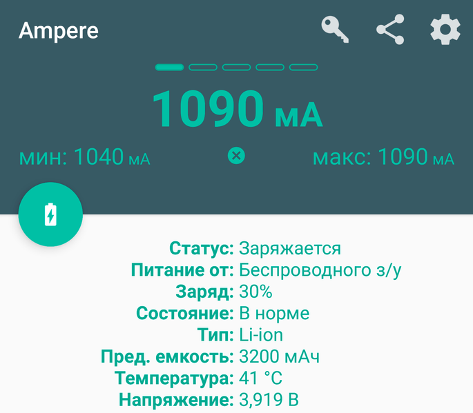 Начальный ток заряда аккумулятора смартфона был очень приличным — более 1,7 А, соответственно и нагрев был заметным. Уже через 20 минут температура стала критической (41,5 °C по показаниям Ampere, у верхнего стекла пауэрбанка 41 °C, боковая поверхность возле разъемов 37 °C, в помещении было около 23-24 °C). Очевидно, оба устройства — и смартфон, и внешний аккумулятор — нагревались и подогревали друг друга, причем отвод тепла от поверхностей взаимодействия был недостаточным.
