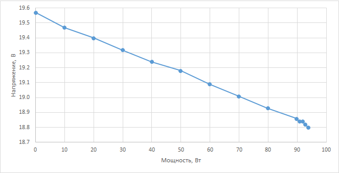 Зависимость выходного напряжения от мощности, потребляемой нагрузкой, показана на графике. График построен при изменении потребляемой мощности с шагом в 10 Вт.