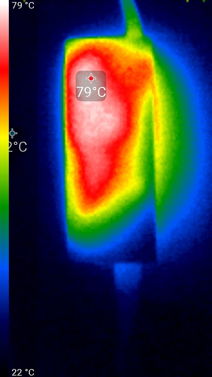 Защита по току срабатывает при мощности энергопотребления 95 Вт. По показаниям тепловизора, при продолжительной работе адаптер питания нагревается до 65 °C (при мощности энергопотребления 94 Вт), а наиболее горячая область находится ближе к торцу с выходным кабелем. Защита по перегреву в ходе тестирования не сработала ни разу.
