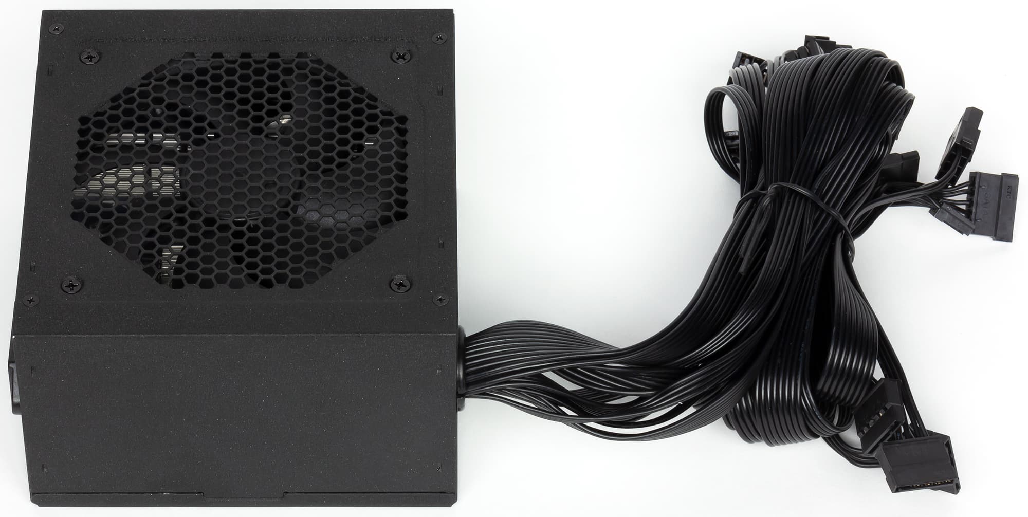 Отметим радикальный подход к подбору разъемов питания для накопителей: пока все придерживаются традиций, Qdion просто признала, что никаких дисковых устройств хранения данных, которые использовали бы пресловутые «молексы» (по стандарту они называются периферийными разъемами питания БП ATX), в современных компьютерах нет. Гораздо чаще (но тоже редко) можно встретить какой-нибудь контроллер вентиляторов или другое не самое распространенное устройство, полагающееся именно на этот тип разъема — для них у Black Storm 650 есть один периферийный разъем. Устройства с питанием от разъема для флоппи-дисководов встречаются еще реже, но в данном случае производитель расщедрился на один такой разъем даже без переходника. Распределение SATA-разъемов по шнурам питания не самое удачное, так как полноценно обеспечить питанием несколько зон установки накопителей будет проблематично, особенно если требуется подключение устройств на больших расстояниях от БП, но в случае типовой системы с парой накопителей сложности маловероятны. Отдельно стоит отметить использование прямых, а не угловых разъемов SATA, что гораздо удобнее при подключении накопителей, размещаемых на плоскости основания для системной платы и в других подобных местах.