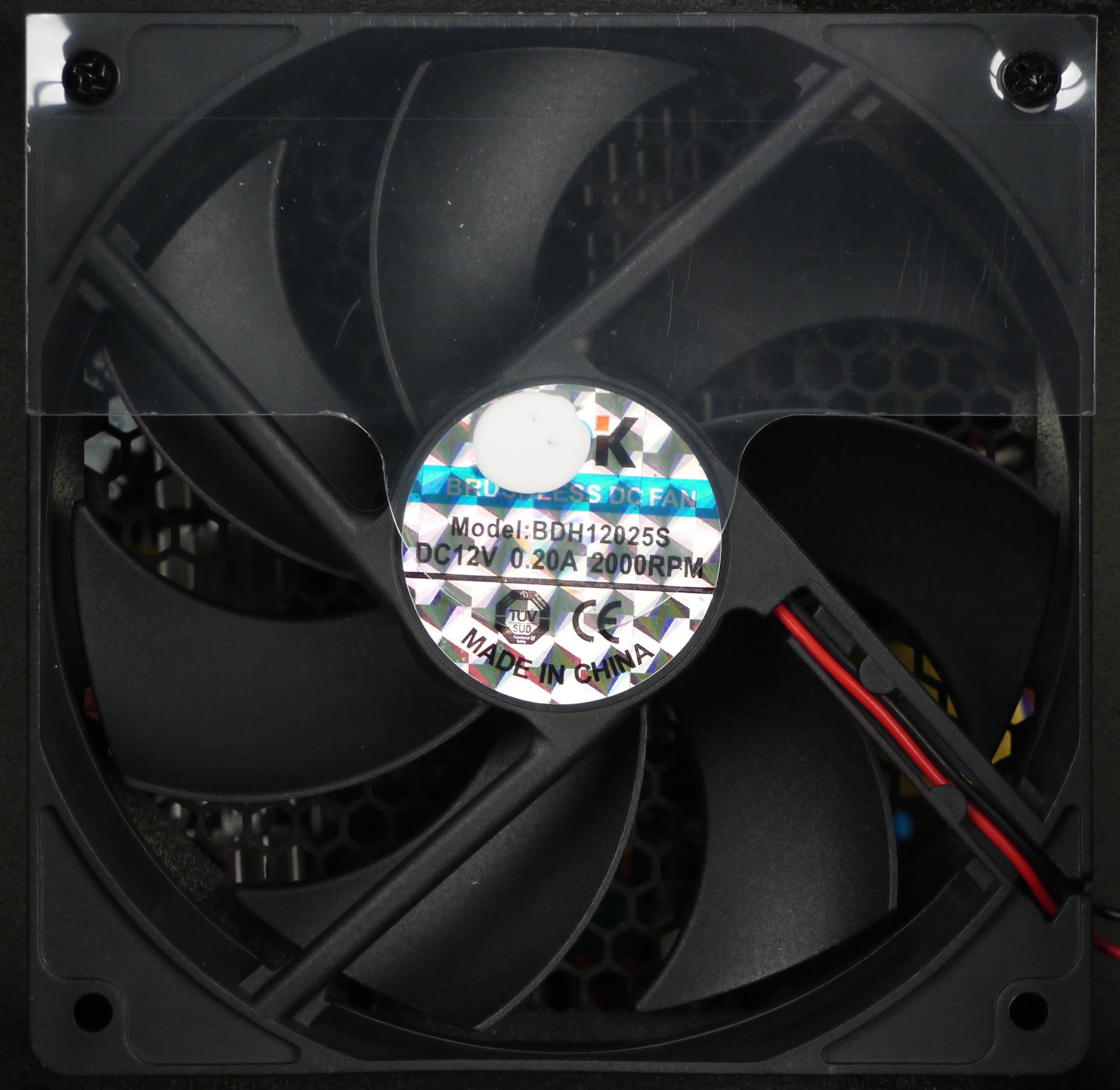 В блоке питания установлен вентилятор BOK BDH12025S типоразмера 120 мм. Вентилятор основан на подшипнике скольжения и имеет скорость вращения 2000 оборотов в минуту, согласно официальным данным. Подключение двухпроводное через разъем.
