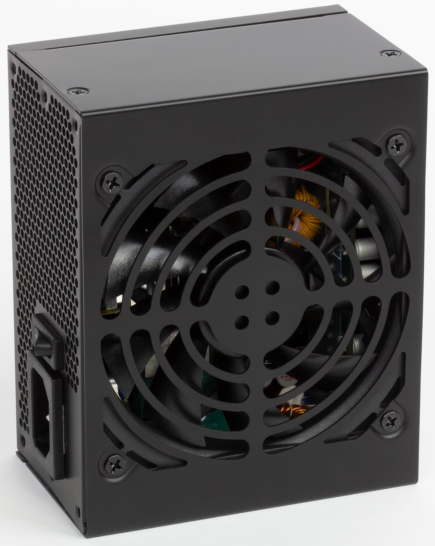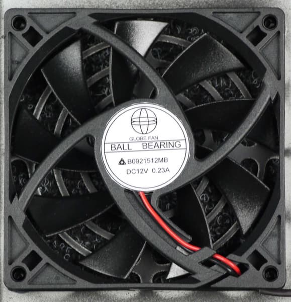 В блоке питания установлен низкопрофильный вентилятор типоразмера 92 мм — B0921512MB производства Globefan. Вентилятор основан на подшипнике качения и, согласно данным производителя, имеет максимальную скорость вращения 2500 оборотов в минуту.
