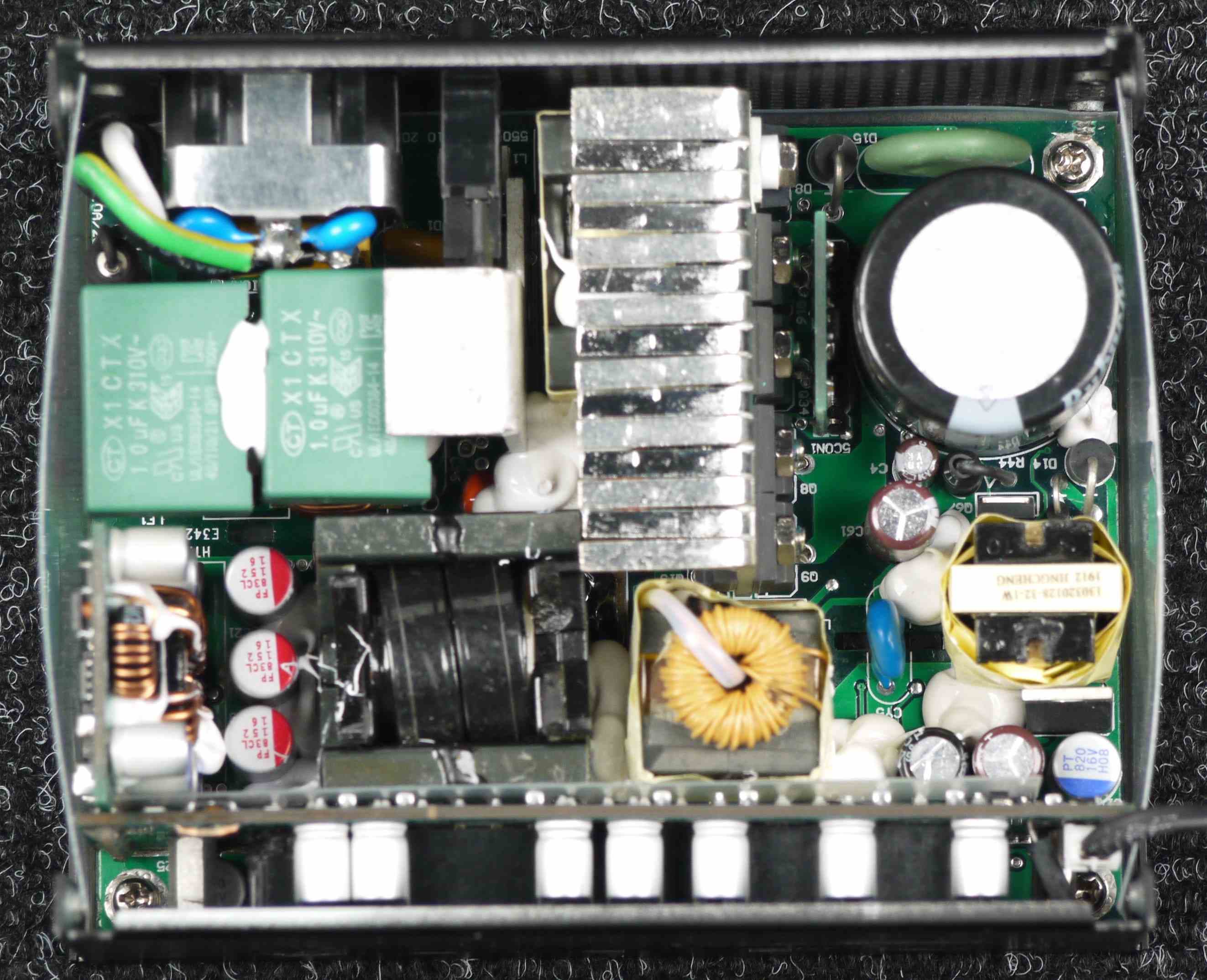 Высоковольтные элементы размещены на одном радиаторе средних размеров, транзисторы синхронного выпрямителя установлены непосредственно на плате методом поверхностного монтажа и охлаждаются только за счет контакта с платой и задней стенкой БП. Нужно отметить, что монтаж элементов внутри корпуса БП не просто плотный, а очень плотный, что, разумеется, сильно затрудняет охлаждение при работе. Независимые источники +3.3VDC и 5VDC установлены на дочерней печатной плате и, по традиции, дополнительных теплоотводов не имеют — это вполне типично для блоков питания с активным охлаждением.