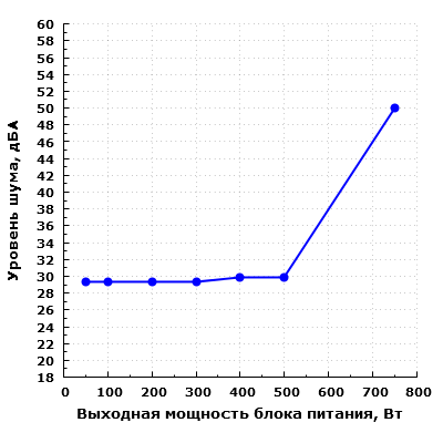 При дальнейшем увеличении выходной мощности уровень шума заметно повышается. К мощности 750 Вт уровень шума достигает значения 50 дБА. Подобный уровень шума является некомфортным даже в условиях офиса. С другой стороны, нагрузка, имеющая подобное потребление, шумит обычно не меньше.
