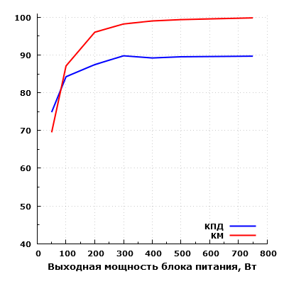 Эффективность БП находится на хорошем уровне. Согласно нашим измерениям, КПД данного блока питания достигает значения свыше 89% в диапазоне мощности от 300 до 750 ватт. Максимальное зарегистрированное значение составило около 90% на мощности 300 Вт. Одновременно с этим, КПД на мощности 50 Вт составил 75%.