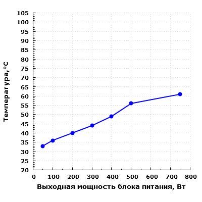 Также стоит учитывать, что в случае работы с остановленным вентилятором температура компонентов внутри БП сильно зависит от окружающей температуры воздуха, и если та установится на уровне 40-45 °C, это приведет к более раннему включению вентилятора.