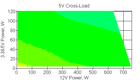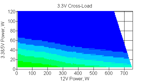 Следующим этапом инструментального тестирования является построение кросснагрузочной характеристики (КНХ) и представление ее на четвертьплоскости, ограниченной максимальной мощностью по шине 3,3&5 В с одной стороны (по оси ординат) и максимальной мощностью по шине 12 В с другой (по оси абсцисс). В каждой точке измеренное значение напряжения обозначается цветовым маркером в зависимости от отклонения от номинального значения.