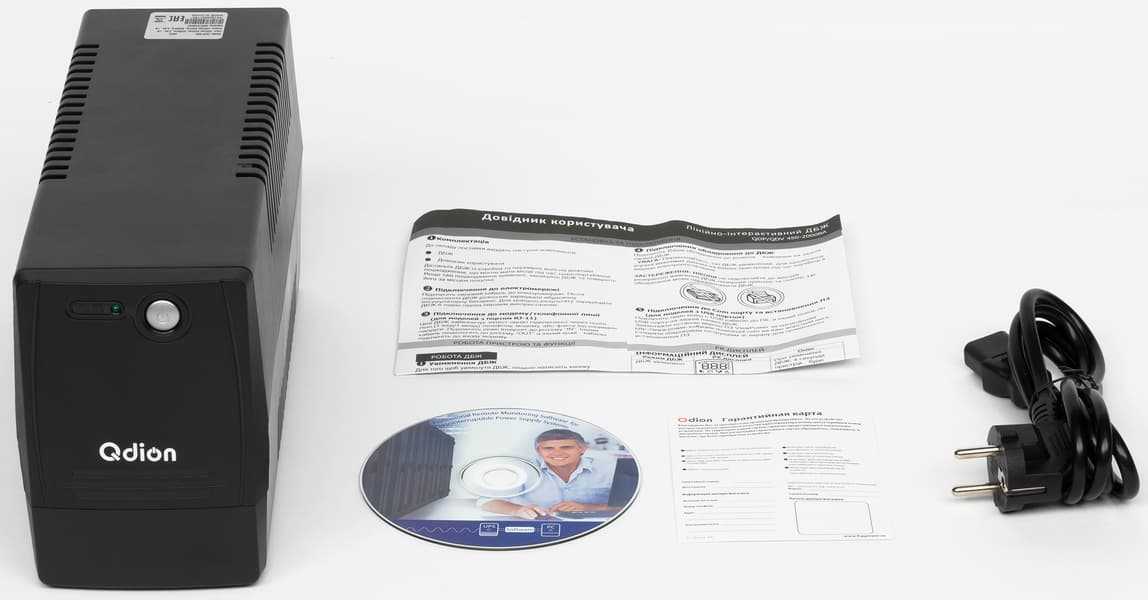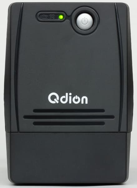 Под маркой Qdion сегодня предлагаются линейно-интерактивные ИБП с мощностью от 450 до 2000 В·А в двух вариантах исполнения — с ЖК-экраном (QDV) и с индикацией на единственном светодиоде (QDP). Мы рассмотрим модель Qdion QDP 850 с выходной мощностью 850 В·А / 480 Вт.