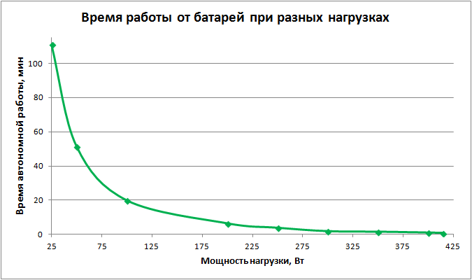 Теперь самое интересное: время автономной работы при разных нагрузках, сначала в виде графика, а затем таблицей.