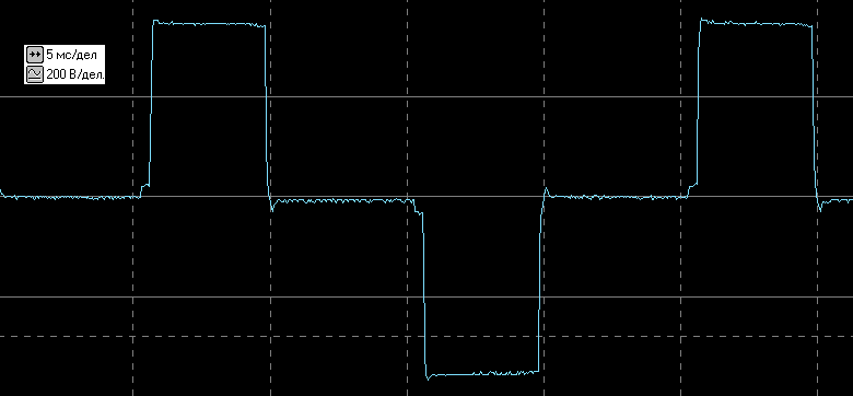 При работе от батареи на выходе инвертора типичная для подобных источников «аппроксимированная синусоида», с математической синусоидой ничего общего не имеющая, но вполне пригодная для работы с нагрузками, оснащенными импульсными блоками питания.