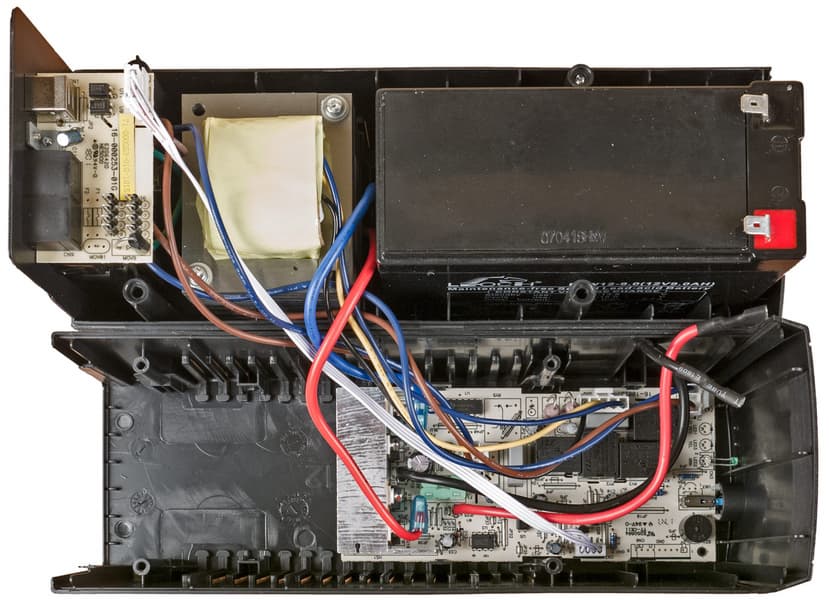 Долго описывать внутреннее устройство Qdion QDP 850 не приходится: одна большая плата с основными электронными компонентами, еще плата поменьше — на ней слаботочные разъемы и компоненты защиты сигнальных цепей, трансформатор и батарея.