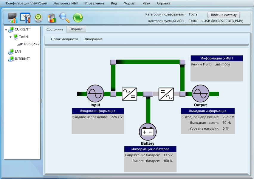 - отображение динамических показателей ИБП в режиме реального времени (напряжение, частота, уровень нагрузки, уровень заряда батарей),