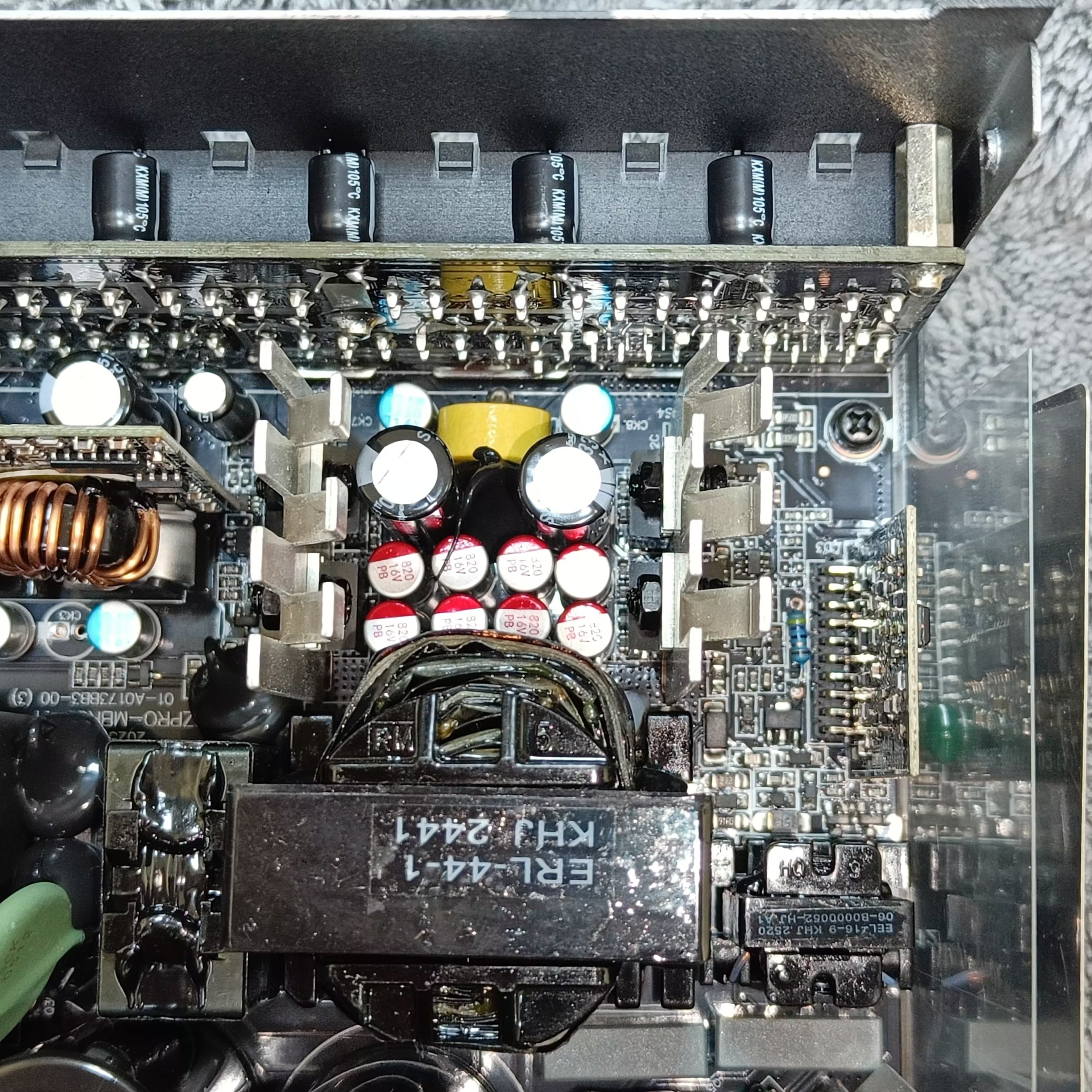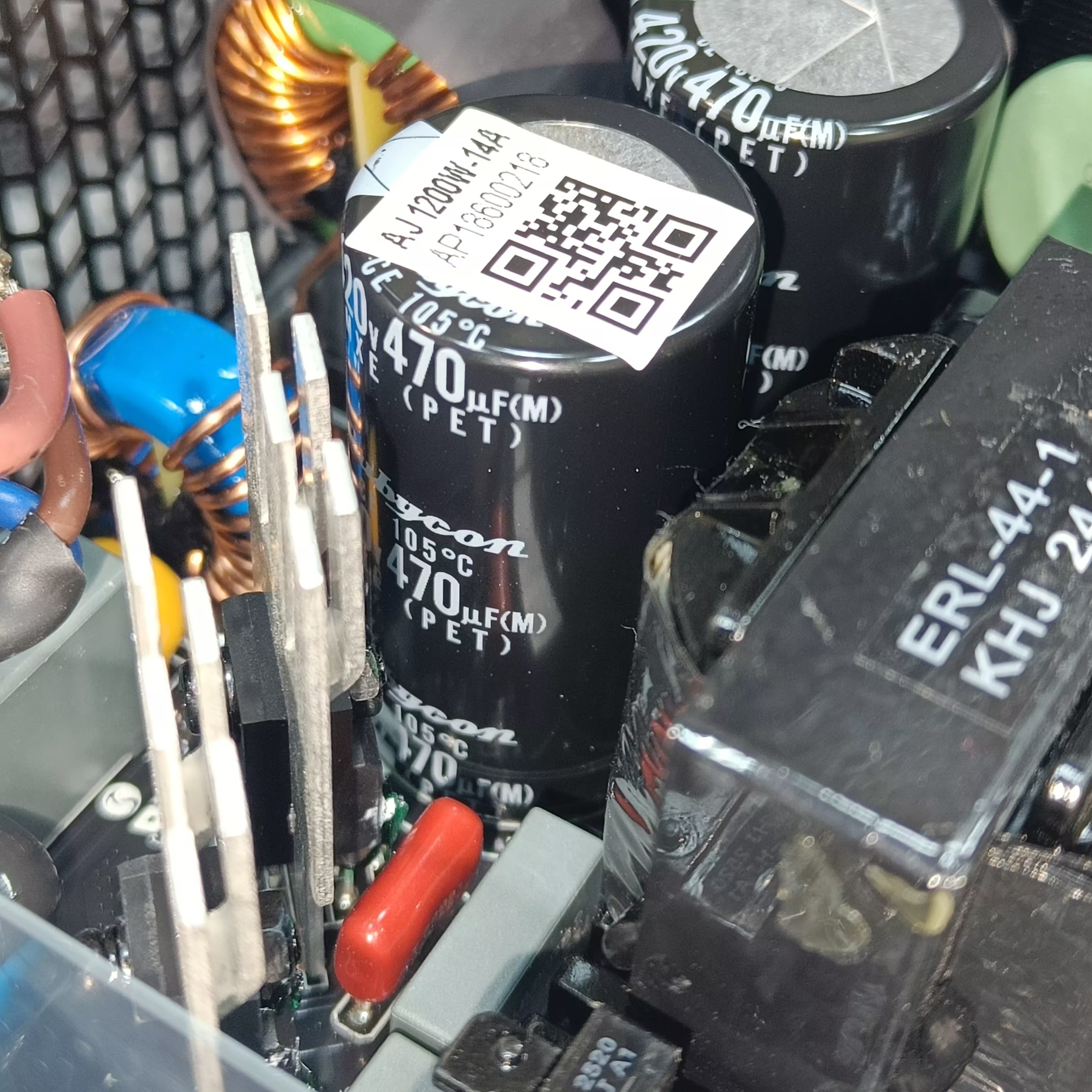 Все конденсаторы в блоке питания имеют японское происхождение. Это продукция под торговыми марками Rubycon и Unicon.