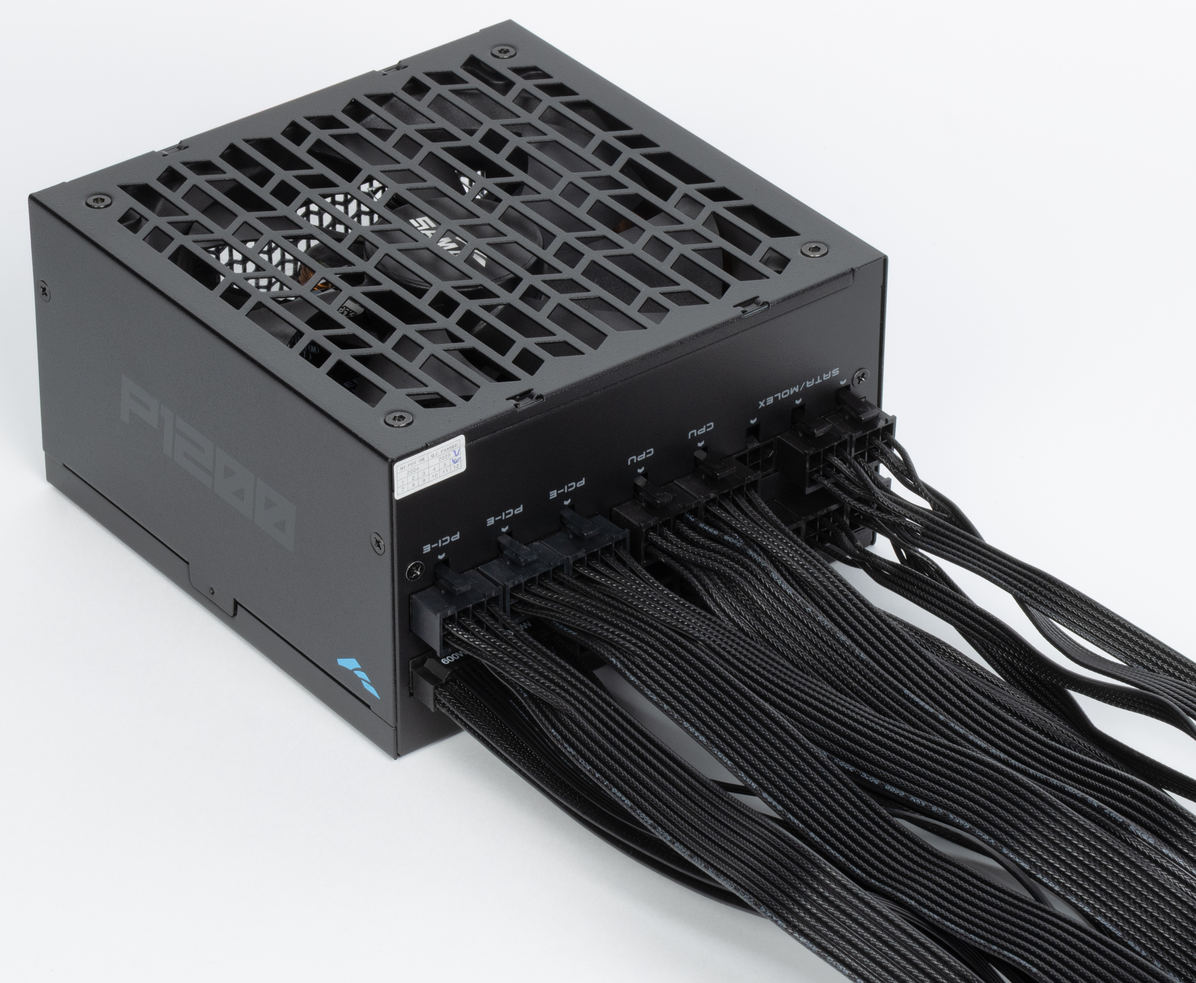Все необходимые параметры указаны на корпусе блока питания в полном объеме, для мощности шины +12VDC заявлено значение 1200 Вт. Соотношение мощности по шине +12VDC и полной мощности равно 100%, что, разумеется, является отличным показателем.