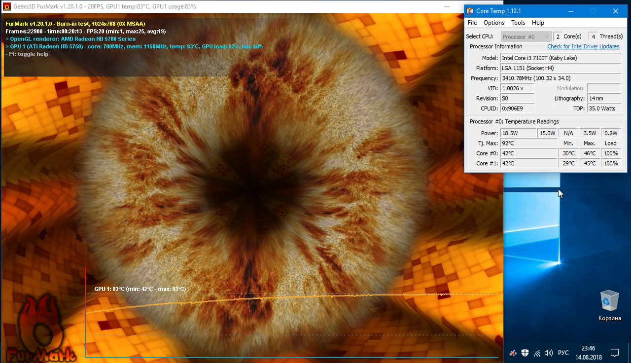 Температура воздуха в помещении во время проведения тестов составляла 24 градуса. В качестве нагрузки использовалась программа FurMark с одновременно запущенными CPU Burner и GPU Stress Test. Температура процессора отслеживалась с помощью программы Core Temp.