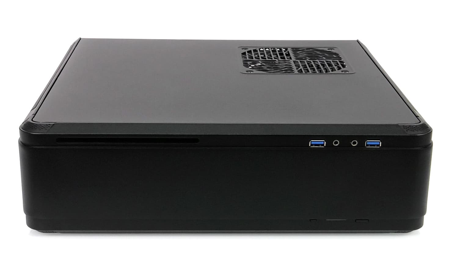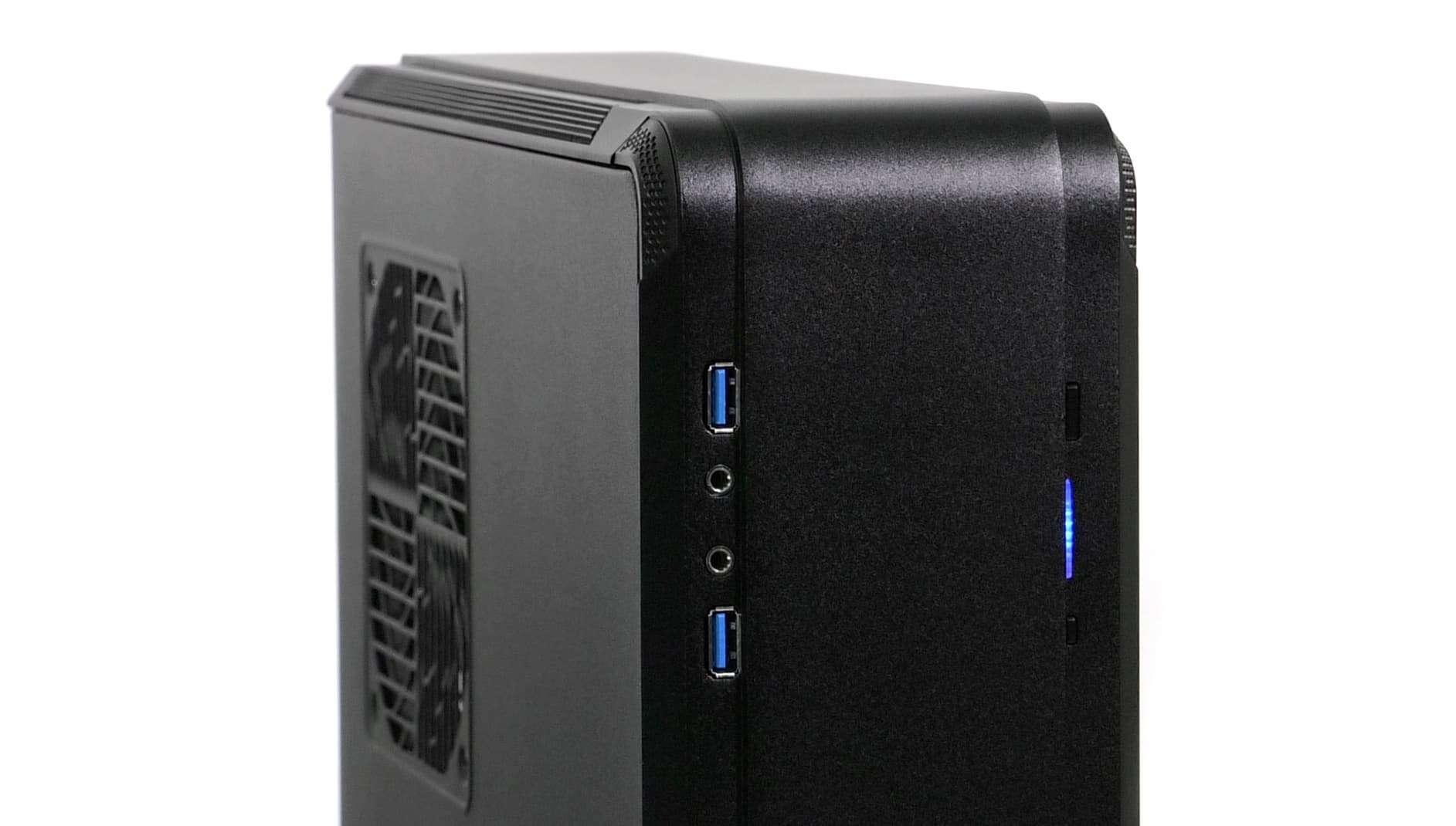 Бо́льшая часть торцов алюминиевого шасси выполнена в виде областей со стальной сеткой для лучшего проветривания комплектующих. Смотрится такое решение аккуратно, внешний вид корпуса не портит. На боковых стенках (опять же, если рассматривать горизонтальное расположение) ничего нет, только прочный алюминий. На верхней стенке находится одно вентиляционное отверстие под корпусной вентилятор, а на нижней — целых три: два под корпусные вентиляторы и еще одно под вентилятор блока питания.